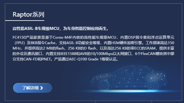 旗芯微基于ARM Cortex M4、M7等系列架构自研设计出覆盖安全标准ISO26262 ASIL-B至ASIL-D的,满足车规AEC-Q100、功能安全标准ISO26262以及各项车规可靠性测试全车规产品,可广泛应用于车身、中控、域控、底盘、安全、动力、电池管理等领域。